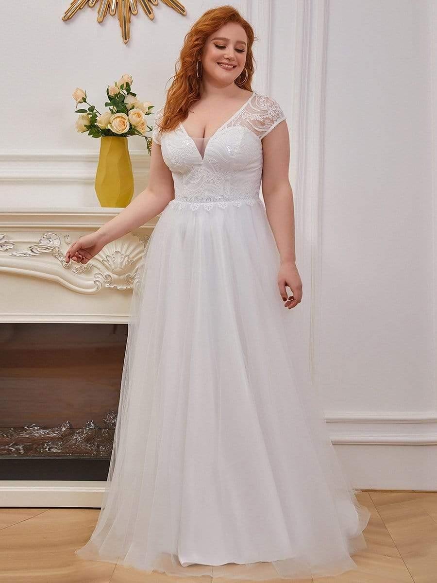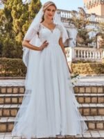 This casual a line outdoor wedding dress will make you look awesome on your big day. Sheer cap-sleeves, plunge neck and the empire bodice along with beautiful lace back goes beyond graceful and romantic. Delicate floral belt decorated around waist-line gives your figure a slimming shape. The bodice is lined and paired with a floor-length fishtail tulle skirt for a classic bride-to-be. If you are a plus-size girl, then this casual a line outdoor wedding dress is available for you too. We have plus size options too. Select yours and be unique bride now!