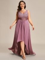 Hold your hearts because this stunning evening dress would make you look like a princess. This plus size evening dress for mature woman features a deep V-neck and is sleeveless. The A-line silhouette of the dress makes it look high-end and fabulous. The paillette designing on the upper body looks stunning as well. This gorgeous dress is perfect for all formal occasions, from evening party, cocktail, weddings to prom, homecoming and graduation!