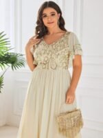 Elegant V-Neck Sequin A-Line Short Sleeves Chiffon Midi Formal Dress