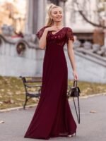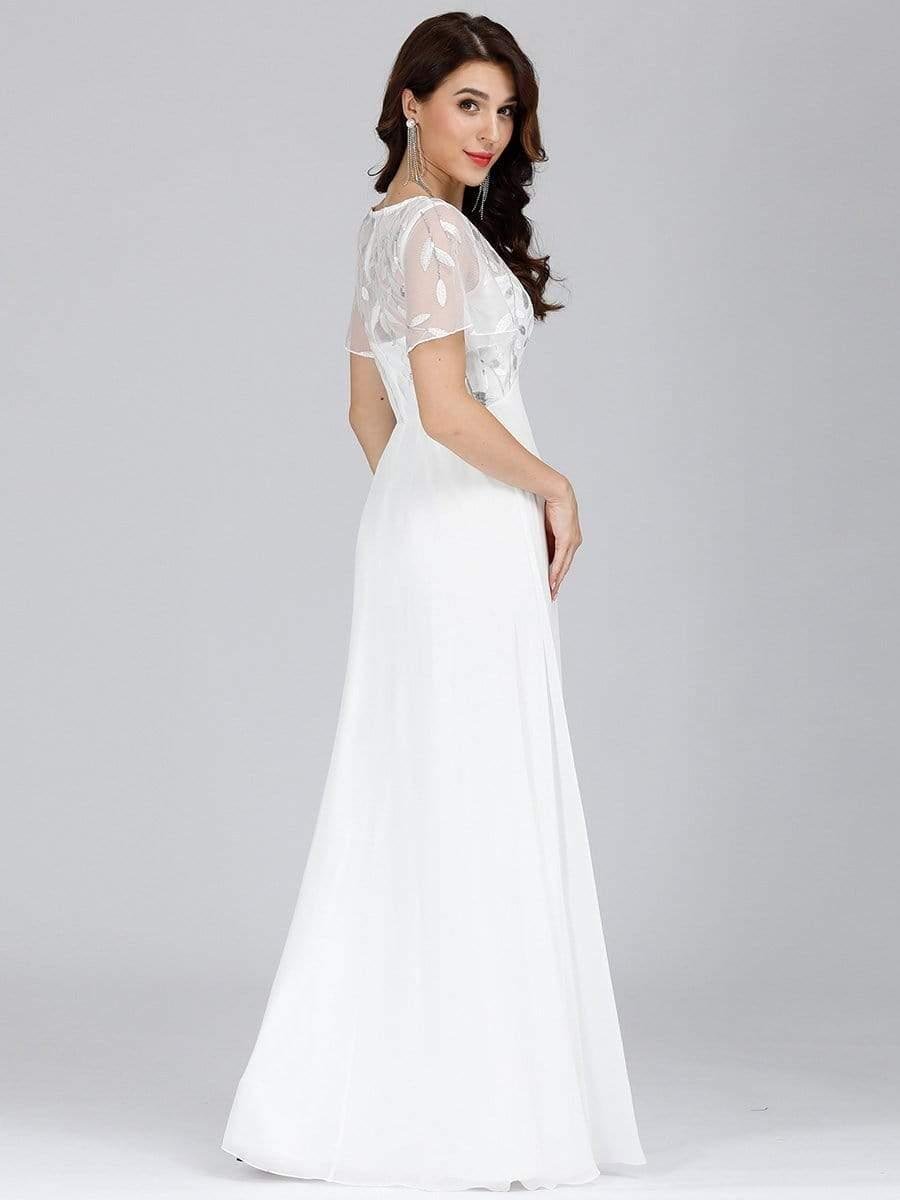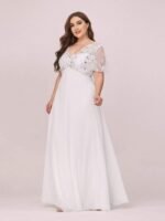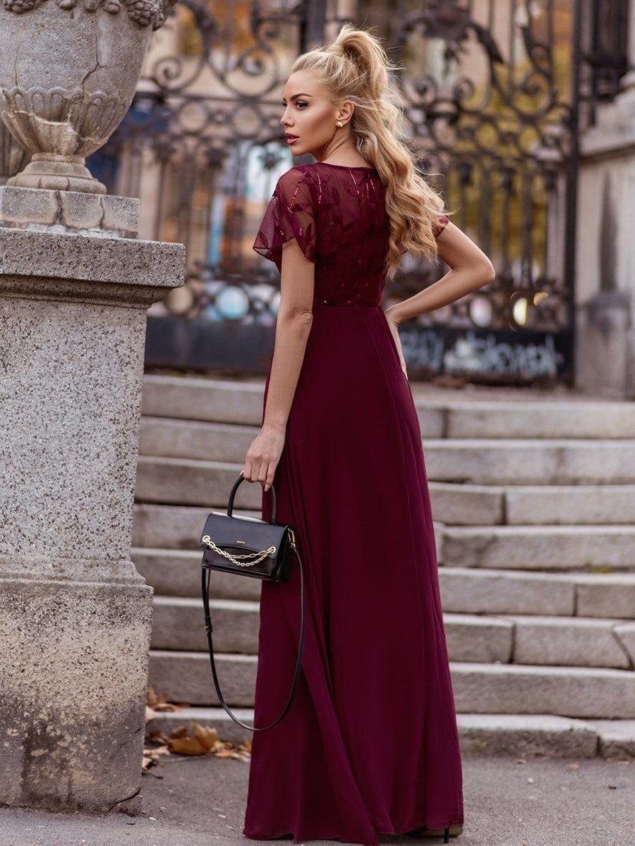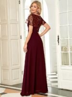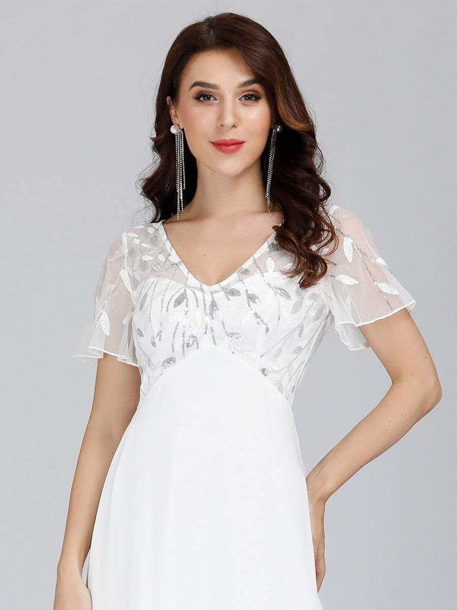 Featuring a sexy deep V neckline, ruffle sleeves and a floor-length flowy tulle skirt, this stunning short sleeves evening dress is a perfect choice for people who are looking for an elegant and sexy look. It oozes romance with the shimmery leave design on the top which add just enough flair to show your taste. We think this gorgeous evening dress is perfect for parties, cocktail, prom, homecoming, graduation, weddings, and any other formal affair! Prices will vary as certain colors of this style is on sale.