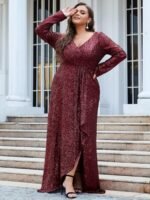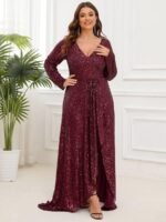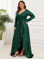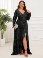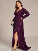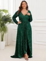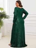 Plus Size Sequin V-Neck Long Sleeve High Slit Bodycon Evening Dress