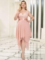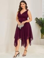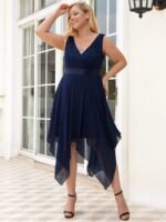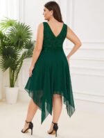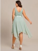 This sleeveless short party dress features a deep V-neckline both front and back giving it a timeless glamour feel. The non-padded short party dress is accented with a gorgeous floral lace detailing as well as a ribbon on the waistband complimenting and accentuating the waistline. The asymmetric hem completes the look with a above the knee square towel skirt. These features create a flowy look and gives it a finishing touch making it the perfect dress to dance your night away! Wear it as a bridesmaid dress or a prom dress, your choice!