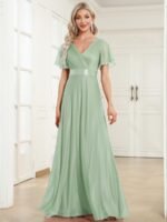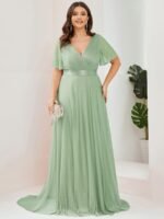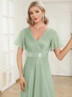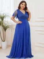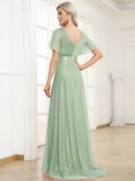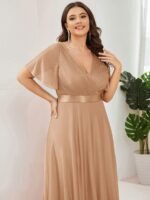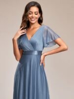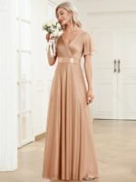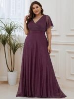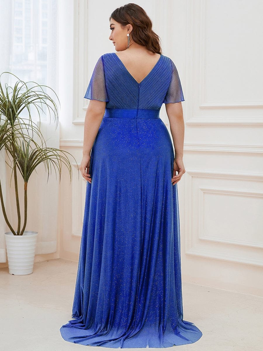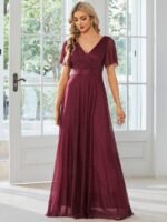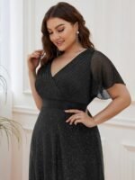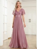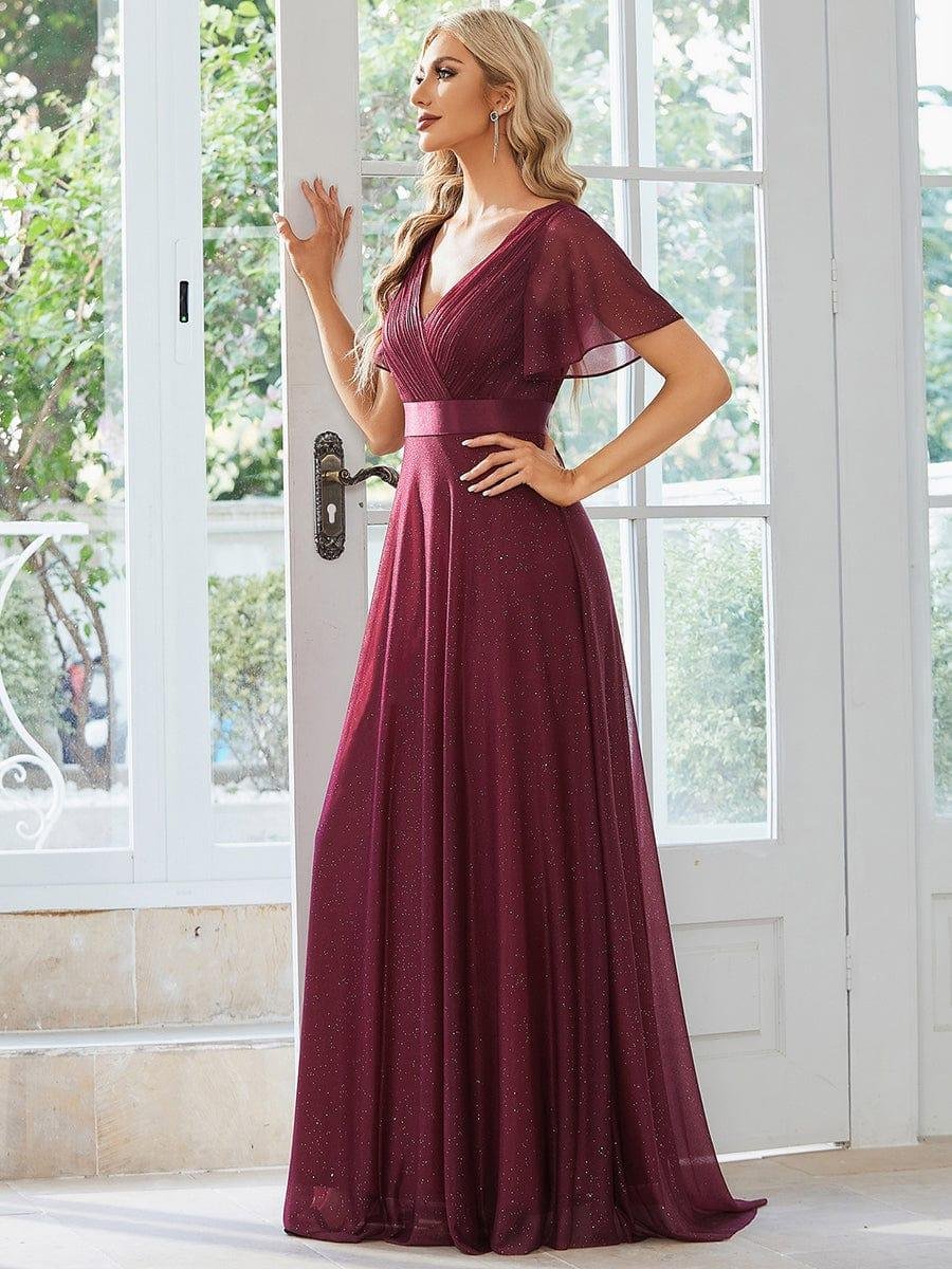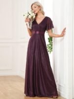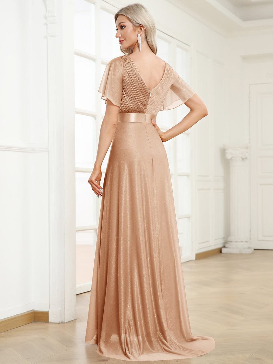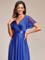Shiny and sophisticated, indulge in this stunning A-line evening dress for your next special formal event. Short flutter sleeves and a plunging ruched v-neck exude elegance, along with a classic A-line silhouette. A luxe ribbon waist and sheer fabric overlay add a magical moment. Pair this floor-length evening dress with heels or flats and your favorite jewelry at evening party, prom or any special occasion.