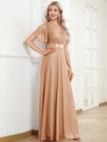 Sparkling Short Sleeve V-Neck Ribbon Waist A-Line Evening Dress