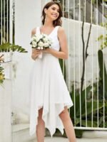 A floral embroidered beauty! This sleeveless short party dress features a deep V-neckline both front and back giving it a timeless glamour feel. The non-padded short party dress is accented with a gorgeous floral lace detailing as well as a ribbon on the waistband complimenting and accentuating the waistline. The asymmetric hem completes the look with a above the knee square towel skirt. These features create a flowy look and gives it a finishing touch making it the perfect dress to dance your night away! Wear it as a bridesmaid dress or a prom dress, your choice!