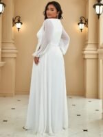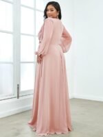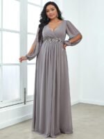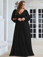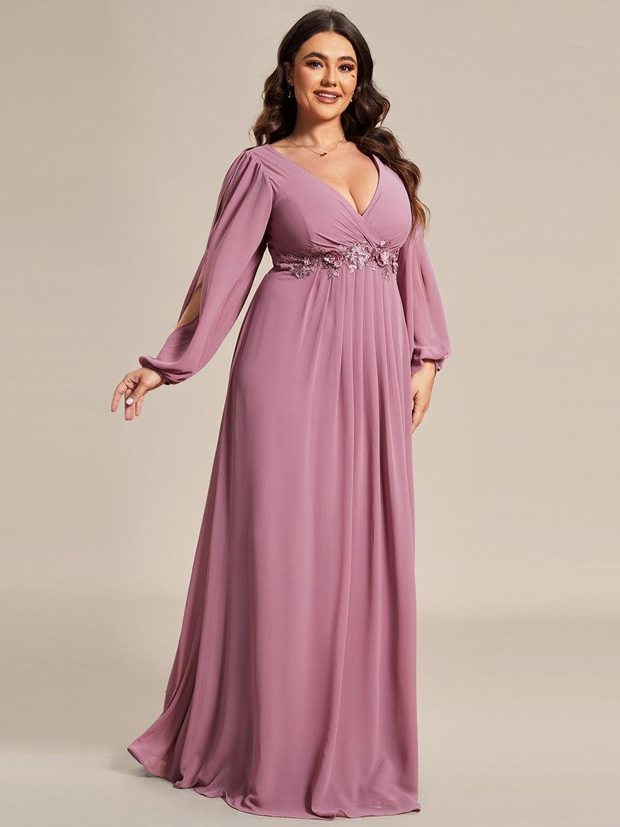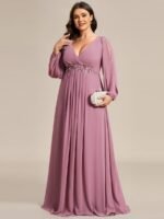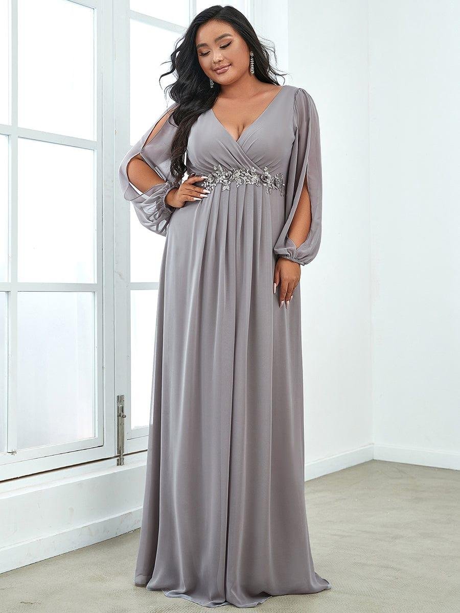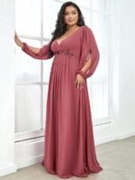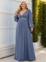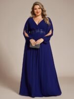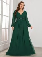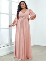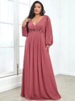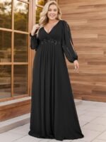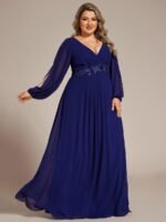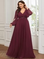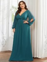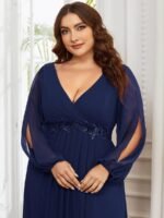 It is time to look like a princess by wearing this gorgeous plus size chiffon long lantern sleeves evening dress for curve. This plus lantern sleeves curvy formal dress features deep V-neck and long bishop sleeves. There is also applique designing near waistline which helps to accentuate the waist. This plus size maxi evening dress with lantern sleeves is solely made for plus size women so they can feel beautiful. We think this gorgeous plus long sleeve formal dress is perfect for all formal occasions, from evening party, cocktail, weddings to prom, homecoming, and graduation!