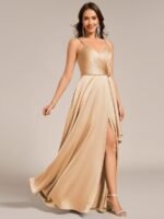 Celebrate in style with this wrap-style satin maxi bridesmaid dress. Designed with delicate spaghetti straps and a flattering waist tie, this gown flatters every figure. The front slit adds a dash of allure, while the luxurious satin fabric ensures a graceful silhouette. Perfect for modern bridal parties or evening events.